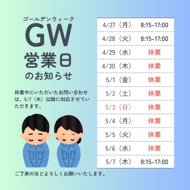 GW(ゴールデンウィーク)期間中の営業日について、4月29日から5月6日までお休みさせていただきます。休業中にいただいたお問い合わせは、5月7日以後にご対応させていただきますので、宜しくお願いいたします💡